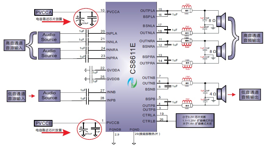 CS8611E內(nèi)置了過流保護,短路保護和過熱保護,有效的保護芯片在異常的工作條件下不被損壞。在供電電源小于16.0V的情況下,CS8611E可以驅(qū)動一個4Ω 的低音喇叭和2個8Ω高音喇叭,整體音頻子系統(tǒng)具有高達90%的效率,使得在播放音樂的時候不需要額外的散熱器。