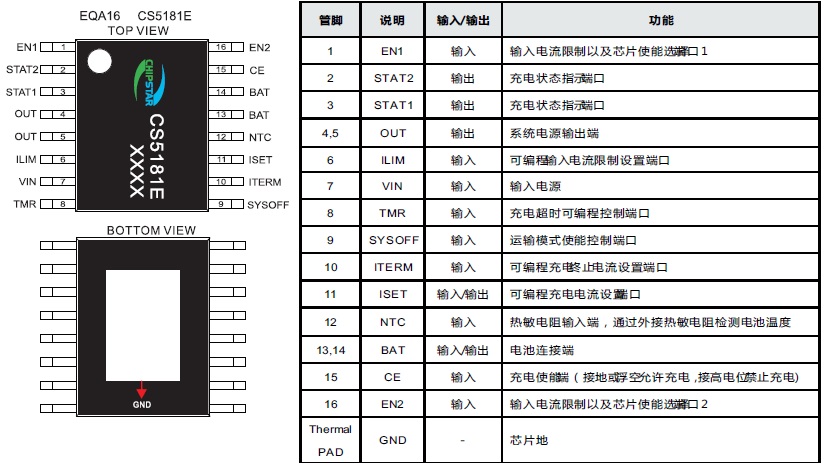 CS5181 CS5181E是一款鋰離子電池線性充電器,適用于空間受限型便攜式應(yīng)用的系統(tǒng)電源路徑管理,通過(guò)USB端口或交流適配器運(yùn)行,最高支持1.5A的充電電流 ,支持非穩(wěn)壓適配器。 EQA-16 3.4V-28V 零功耗運(yùn)輸模式,電源路徑管理,1.5A線性單節(jié)鋰電池充電管理IC