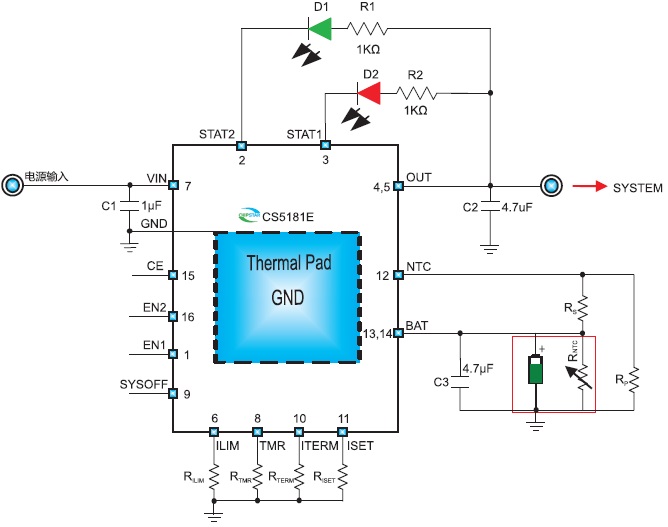 CS5181E具有完善的保護(hù)功能,包括輸入欠壓和過(guò)壓保護(hù)、輸出欠壓和過(guò)壓保護(hù)、芯片溫度調(diào)節(jié)和保護(hù),充電超時(shí)保護(hù)、電池過(guò)壓和短路保護(hù)、電池溫度保護(hù)。此外芯片通過(guò)外接的兩路LED指示燈,可對(duì)充電過(guò)程實(shí)現(xiàn)全程監(jiān)控。采用EQA-16封裝。