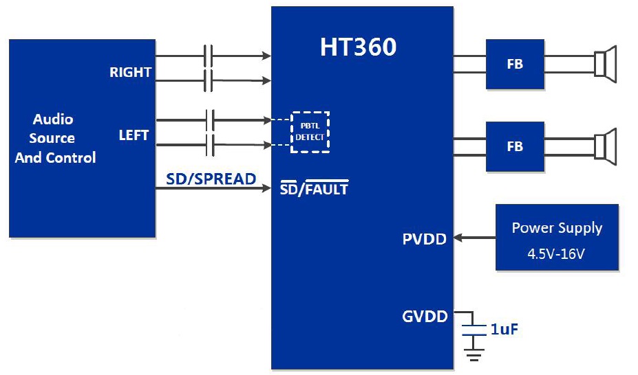 HT360 是一款高效D 類音頻功率放大器。在14.5V供電的立體聲(BTL)模式下,能夠持續提供2*20W/4Ω功率輸出;在單聲道(PBTL)模式下,能夠持續提供30W/4Ω功率輸出。