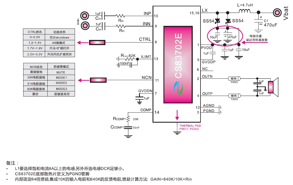 CS83702(單節鋰電池3.7V供電內置升壓18W單聲道D類音頻功放IC) |