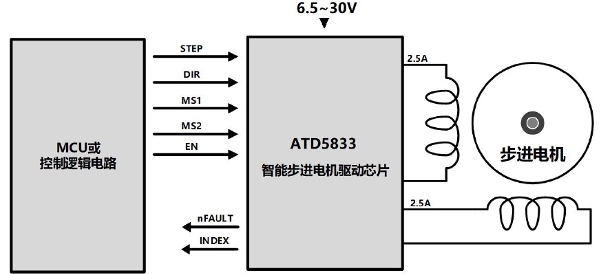 產品功能: ATD5833是一款內置有譯碼器的智能步進電機驅動器。其輸出驅動能力達到30V ±2.5A,最高支持16細分,同時可實現插補細分工作。