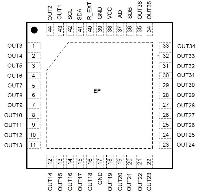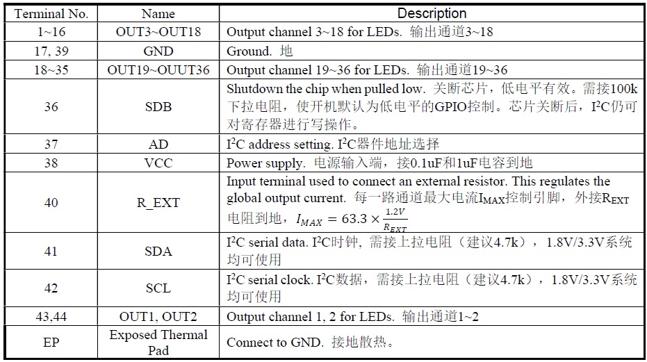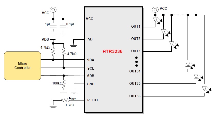 HTR3236是一款36路LED PWM驅(qū)動(dòng)器,PWM頻率可固定為3kHz或22kHz。每一路最大輸出電流可通過(guò)外置電阻REXT調(diào)節(jié),最大38mA,并