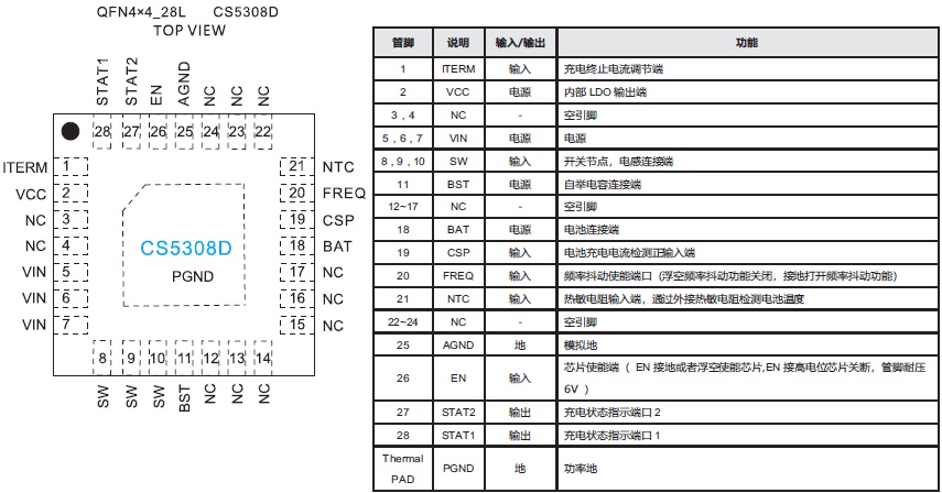 CS5308D具有完善的保護功能,包括輸入欠壓和過壓保護、電池過壓和短路保護、電池溫度保護、芯片溫度調節和保護。此外芯片通過外接的兩路LED指示燈,可對充電過程實現全程監控。采用QFN4X4_28L封裝。