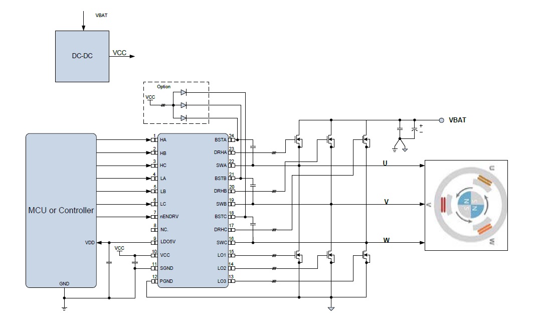 RM6101A為一款專用于100V三相馬達(dá)驅(qū)動的NMOS柵極驅(qū)動器IC。IC采用先進(jìn)的BCD工藝,高側(cè)自舉供電端具有高達(dá)100V的耐壓能力,同時集成輸出能力高達(dá)1A/1.8A的6通道驅(qū)動器。集成低側(cè)和高側(cè)UVLO功能,保證驅(qū)動器能為NMOS提供正常的驅(qū)動電壓,防止由于錯誤的驅(qū)動電壓而導(dǎo)致功率管損壞或者系統(tǒng)異常。該IC集成了低靜態(tài)電流的5V LDO, 專為MCU或者馬達(dá)控制器供電。IC內(nèi)部集成了自舉二極管,專為高側(cè)供電電容提供充電。集成LDO和自舉二極管節(jié)省了外部所用元器件并節(jié)省了系統(tǒng)成本。IC配備的使能控制端ENDRV為低電平時,IC消耗的靜態(tài)電流<30uA,但仍能維持MCU或者主控的供電。這一特性有利于延長在待機(jī)模式下的電池壽命,因此非常適合電池供電的應(yīng)用場合。采用TSSOP-20/TSSOP-24封裝。
