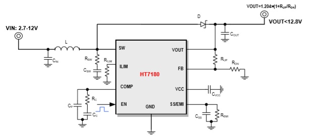 HT7180是一款高功率異步升壓轉換器,集成 22mΩ功率開關管,為便攜式系統提供高效的 小尺寸解決方案。 HT7180具有2.7V至12V寬輸入電壓范圍,可為 采用單節或兩節鋰電池的應用提供支持。該器 件具備10A開關電流能力,并且能夠提供高達 12.8V的輸出電壓。 HT7180還支持可編程的軟啟動,以及可調節的 開關峰值電流限制。HT7180還支持兩種不同的 tr/tf,以適應不同的EMI和效率需求。 此外,該器件還提供有13V輸出過壓保護、和熱 關斷保護。