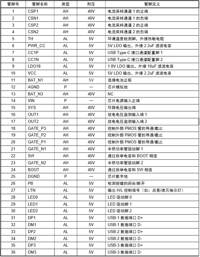 2-4節電池快充充電管理SOC ,內置PD3.0、PD2.0、QC3.0、QC2.0、BC1.2 DCP、UFCS等協議 |
