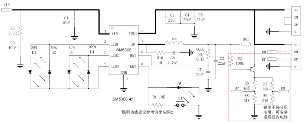SM5308 的高集成度與豐富功能,使其在應用時僅需極少的外圍器件,并有效減小整體方案的尺寸,降低 BOM 成本。
