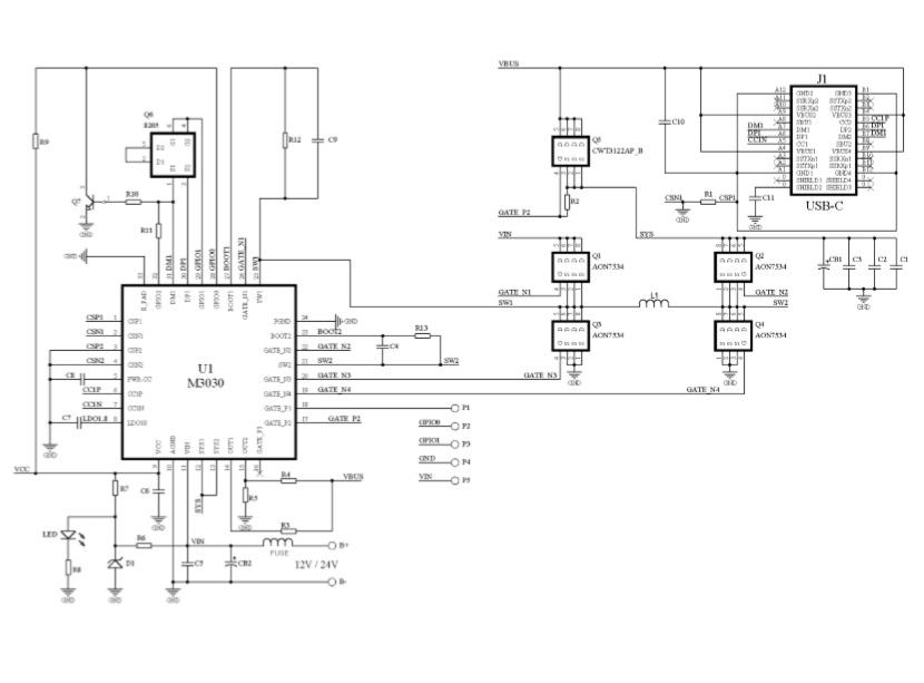 M3030 是一款面向車載充電器應用的電源管理SOC,集成了雙向升降壓電壓變換器、16位高精度ADC、USB Type-C 接口、MOSFET 驅動接口,兼容BC1.2 DCP、PD3.0/PPS、QC2.0、QC3.0、AFC、FCP、APPLE 2.4A 等流行的快充協議,支持過壓保護、過流 保護等完備的安全保護機制。 外圍僅需很少的元件,即可組成33W的車載充電器應用方案