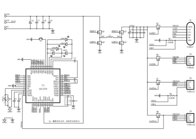 M12229H是一款面向2串電芯 35W移動電源應用的專用 SOC,集成了同步升降壓電壓變換器、電池充放 電管理模塊、顯示模塊、電量計算模塊,提供35W 輸入/輸出功率,支持PD3.0、QC3.0、AFC、FCP、SCP、 BC1.2 DCP 等主流快充協議,并提供輸入/輸出的過壓/欠壓、電池過壓、過充/過放、NTC 過溫、放電過流、輸出短路保護等完備的保護功能。配合極簡的外圍電路,即可組成35W多口移動電源。 |