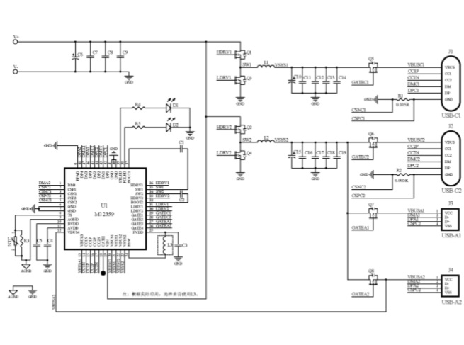M12150是一款支持PD3.1的雙口全兼容快充協(xié)議IC,集成了微處理器、USB Type-C 接口、快充協(xié)議控制器、高精度電流采樣電阻,支持DFP/Source功能。利用TL431和光耦組成的反饋電路調整前級AC-DC的輸出電壓,搭載極少的元件可以組成C口協(xié)議調壓、A口降壓的 C+A獨立雙口功率可分配的快充解決方案。 |