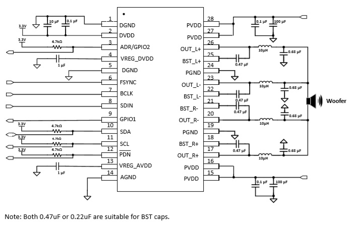 - 供電電壓范圍 PVDD: 4.5V to 21V