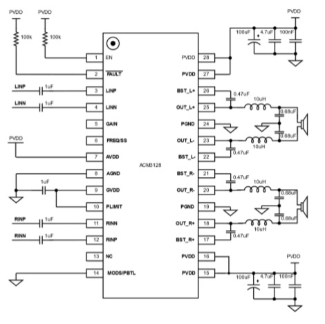 ACM3128(動(dòng)態(tài)調(diào)整升壓CLASS H功能、40W立體聲/80W單聲道D類(lèi)音頻功放IC) |