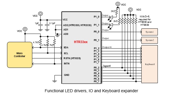 HTR3339是一款I2C和SMBus IO擴展器 , 2.2V~5.5V電源供電。16個IO端口中的任何一個都可以單獨配置為輸入或輸出。此外,任一IO可驅動LED。