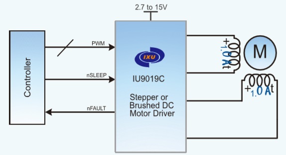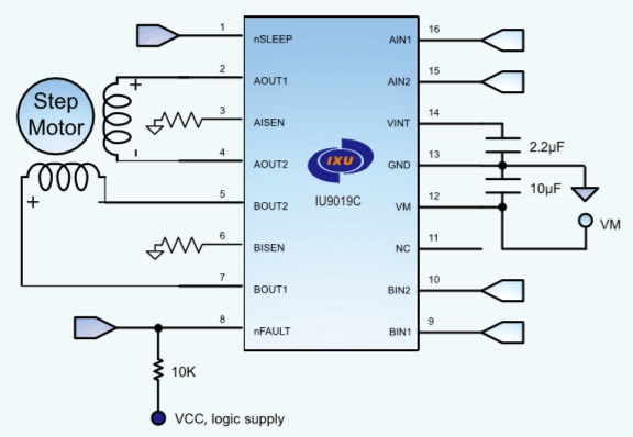 IU9019C為玩具、打印機和其它電機一體化應用提供一種雙通道電機驅動方案。IU9019C有兩路H橋驅動,可以驅動兩路刷式直流電機,一個雙極步進電機,多個螺線管或者其它感性負載。每個H橋的功率輸出模塊由N溝道功率MOSFET組成,用于驅動電機繞組。每個H 橋均具備調節或限制繞組電流的電路。該器件利用故障輸出引腳實現內部關斷功能,提供過流保護、短路保護、欠壓鎖定和過熱保護,并提供了一種低功耗休眠模式。另外提供一個錯 誤輸出管腳nFAULT,當過流過溫保護的時候,nFAULT為低電平.