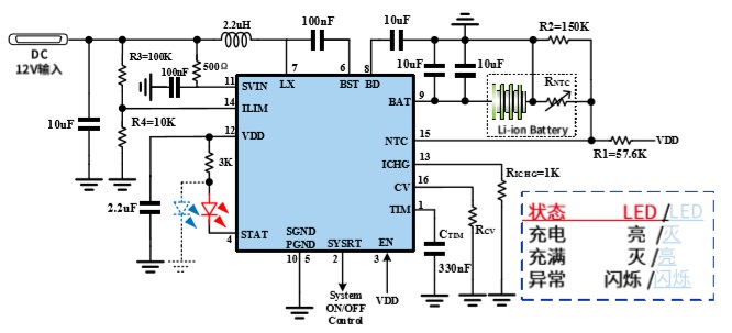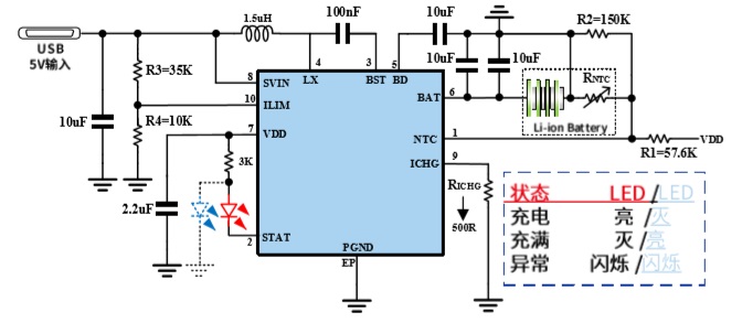 ■ LED指示燈使用時需接限流電阻到VDD,推薦3K。如需使用雙燈方案,必須按照圖中LED燈顏色配置,請購買對應顏色LED燈進行實驗,充 電時紅燈亮,藍燈滅;充滿時藍燈亮,紅燈滅;異常時紅燈藍燈交替閃爍。
