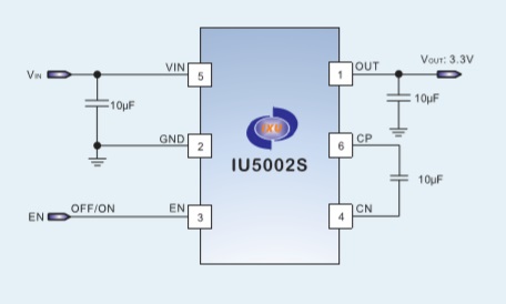 產品功能: IU5002S是一個具備低噪聲、恒定開關頻率(650KHz),在2.0V-5.0V供電范圍內恒定3.3V輸出、電容式DC-DC轉換器。