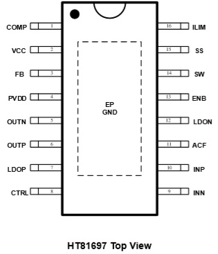 HT81697具有先進的擴頻功能來抑制EMI。如果系統對EMI高度敏感,則可以將升壓關閉,并將功放切換到AB類。 此外,HT81697集成了輸出端過流保護、片內過溫保護、升壓過壓保護等功能。