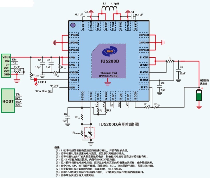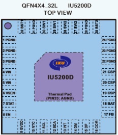 IU5200D支持I2C接口來控制充電過程的各個細節參數,包括電池節數以及規格。采用QFN4X4_32L封裝。
