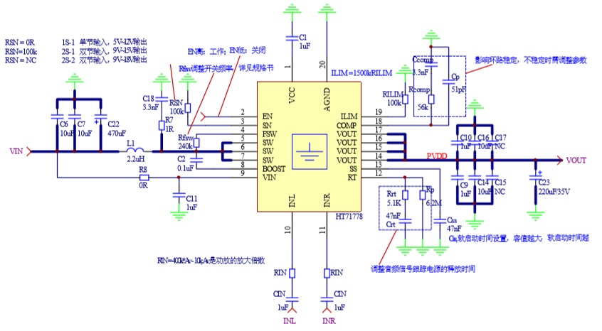 HT71778還支持可編程的軟啟動,以及可調節的開關峰值電流限制。 此外,該器件還提供有22V輸出過壓保護、 逐周期過流保護和熱關斷保護。