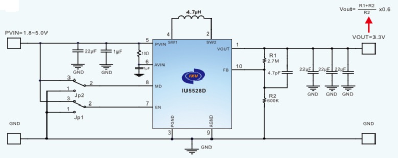 IU5528D由電流模PWM控制環路,誤差放大器,比較器和功率開關等模塊組成。該芯片可在較寬負載范圍內高效穩定的工作.IU5528D的輸入電壓為1.8V至5.0V提供可調輸出電壓為(1.2V至5V) .在輸出電壓為3.3V的情況下, 輸入從3.0V到5.0V,它能提供最大2.6A的負載電流. IU5528D可以通過調整兩個外加電阻來設定輸出電壓.