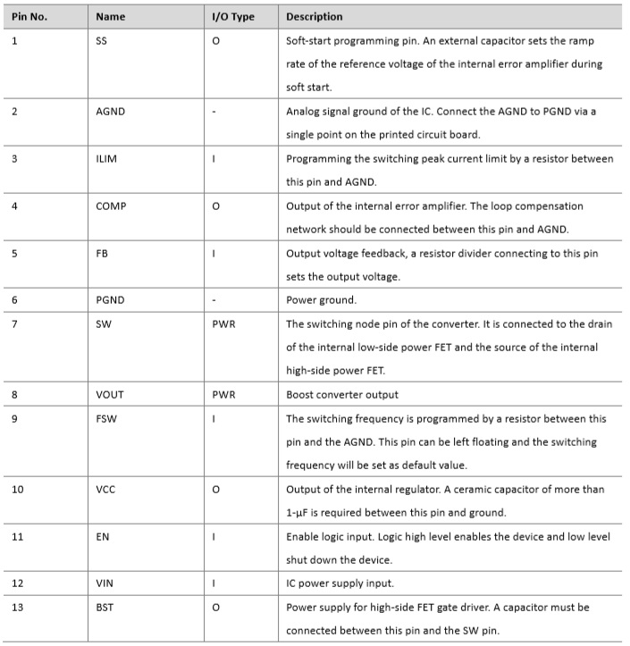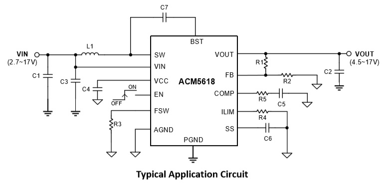 ACM5618采用自適應(yīng)恒定關(guān)斷時(shí)間峰值電流控制模式,以調(diào)節(jié)輸出電壓并確保快速瞬態(tài)響應(yīng)。ACM5618在脈沖寬度下工作中、重載時(shí)的調(diào)制(PWM)模式,隨著負(fù)載電流的減小切換到脈沖頻率調(diào)制(PFM)模式以保持高效運(yùn)行。ACM5618提供準(zhǔn)確在寬負(fù)載和VIN范圍內(nèi)進(jìn)行調(diào)節(jié),并保持低輸出紋波。ACM5618提供17.2V輸出過(guò)電壓保護(hù),電流跟蹤保護(hù)和過(guò)熱保護(hù)。