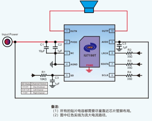 IU7190T是一款支持I2S數字音頻信號輸入、高效率、超低EMI、3.1W單聲道D類音頻功率放大器。其內置有數模轉換器(DAC)和多級D類調制器,具備出色的音頻性能。利用芯片的I2S數字音頻串行接口傳送至放大器,可以顯 著降低噪聲源對所傳輸音頻的影響。另外也避免了主控芯片內置音頻解碼DAC所帶來的噪聲,最終獲得較高的信噪比以及較小失真度。IU7190T閉環數字輸入設計保留了數字放大器的優勢,同時又具有極佳的PSRR和音頻性能。