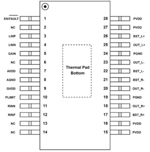 ACM8831 1×135W, 單聲道輸出 (4Ω, 32V, THD+N = 10%) TSSOP-28(散熱片朝上) 4.5V-34V 內置DSP、I2S數字輸入135W大功率單聲道D類功放IC