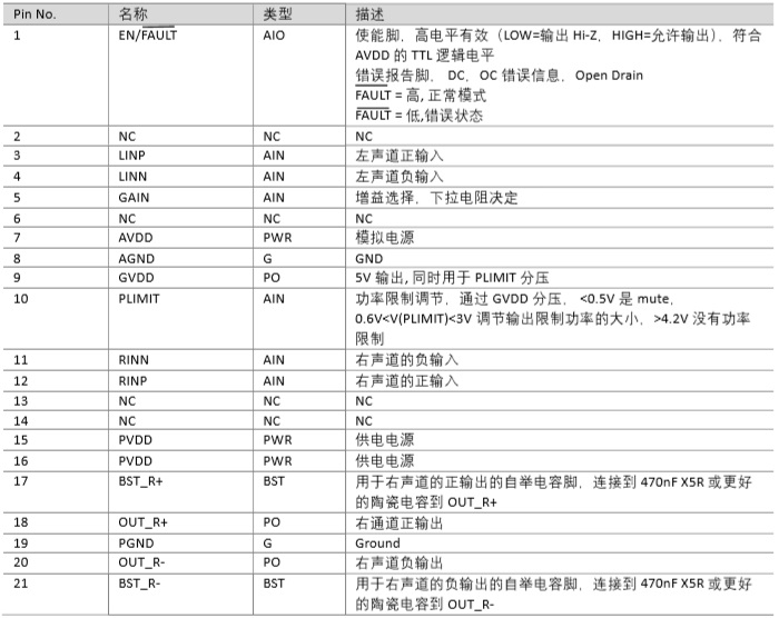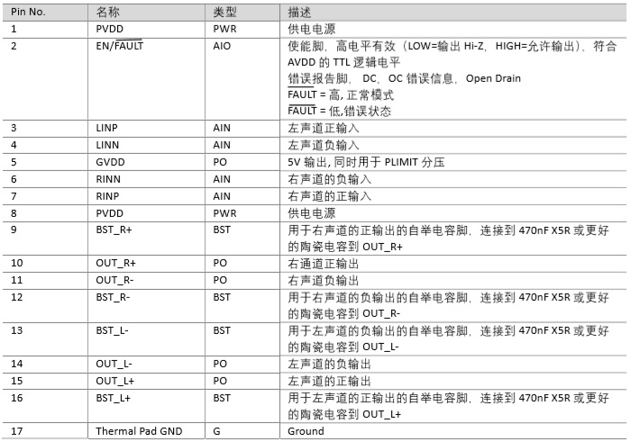 ACM3156 2×110W, 1%THD+N, 32V、4Ω、 BTL  1×220W, 1%THD+N, 32V、2Ω 、PBTL  TSSOP-32(頂部散熱) 4.5V-32V 2×110W立體聲/220W單聲道D類音頻功率放大器 TPA3116