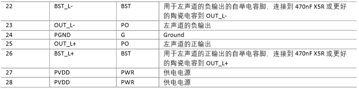 ACM3128 2×32.5W, 1% THD+N, 24V, 8 , BTL; 1×65W, 1% THD+N, 24V, 4 , PBTL; 2×42W, 1% THD+N, 24V, 6 , BTL; 1×84W, 1% THD+N, 24V, 3 , PBTL; 2X48W, 1% THD+N, 22V, 4 , BTL; TSSOP-28 4.5V-26.4V 動態調整升壓CLASS H功能、40W立體聲/80W單聲道D類音頻功放IC AD52090/TPA3110