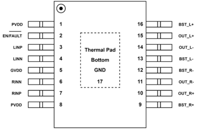 - THD+N ≤ 0.02% 測試條件: 1W, 1kHz, PVDD = 12V