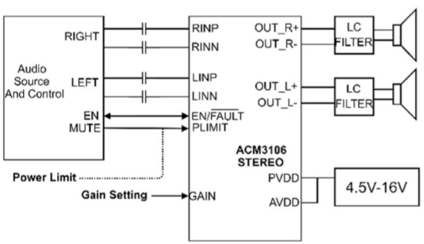 ACM3106 工作電壓范圍 4.5V-16V,輸出配置可選用立體聲 BTL,也可選用單聲道 PBTL。