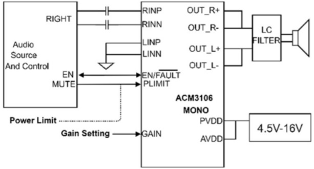 ACM3106 還提供全差分輸入,pop 音抑制,提供兩種增益 (26dB and 36dB)選擇功能。提供可調節的輸出功率限制功能 和輸出直流檢測保護功能用于保護喇叭。 另有短路保護、 過熱保護和過壓/欠壓保護可防止器件在故障情況下受損。