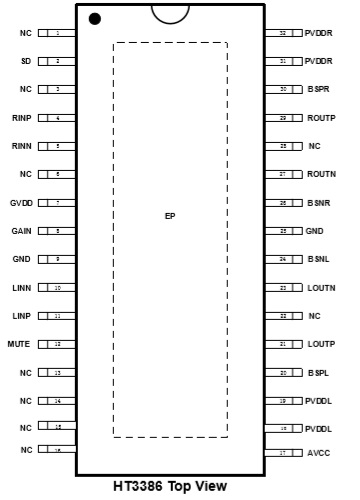HT3386 2×40W (VDD=18V, RL=4Ω, THD+N=10%); 2×50W (VDD=24V, RL=6Ω, THD+N=10%) ; 2×40W (VDD=24V, RL=8Ω, THD+N=10%) ETSSOP-32 4.5V-26V 2×50W D類立體聲音頻功放 TPA3118/AW83118