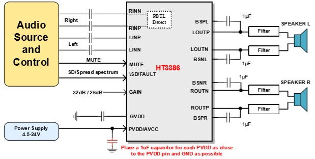 此外,HT3386內置關斷功能使待機電流最 小化,同時內置了MUTE功能,還集成了過壓保 護、直流保護、短路保護、熱保護和電源欠壓 異常保護等功能,可全面防止出現故障。