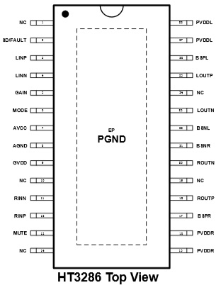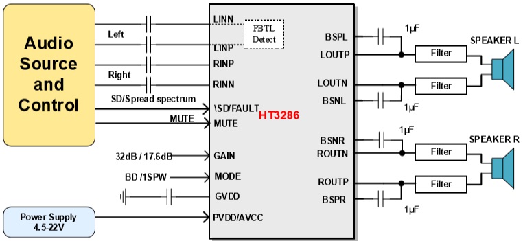 HT3286是一款高效D類音頻功率放大器。 在22V供電的立體聲(BTL)模式、THD+N=10% 條件下,能夠持續提供2*33W/8Ω功率輸出;在單聲道(PBTL)模式、THD+N=1%條件下,能夠持續提供50W/4Ω功率輸出。