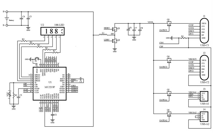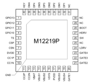 M12219P 是一款面向單電芯30W移動電源應用的專用 SOC,集成了同步開關升壓變換器、電池充放電 管理模塊、顯示模塊、電量計算模塊,支持 PD3.0、QC3.0、AFC、FCP、SCP、BC1.2 DCP 等主流快充協議,并提供輸入/輸出的過壓/欠壓、電池過充/過放、NTC 過溫、放電過流、輸出短路保護等完備的保護功能。配合極簡的外圍電路,即可組成支持188-屏顯示功能的30W多口移動電源。
