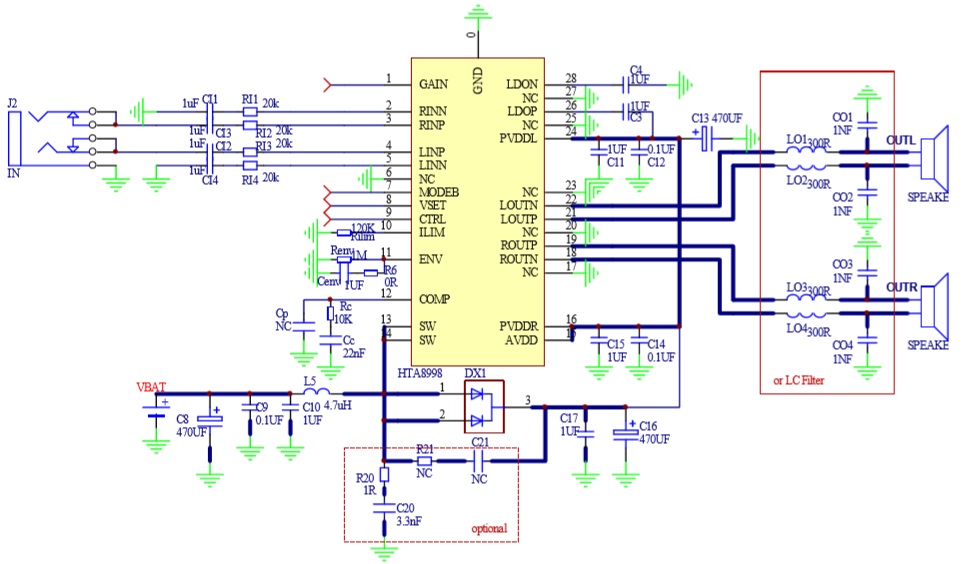 此外,HTA8998內部集成免濾波器調制技術, 能夠直接驅動揚聲器,內置的關斷功能使待機電流最小化,還集成了輸出端過流保護、片內過溫保護、輸入電源欠壓異常保護、升壓電壓過壓保護等功能。