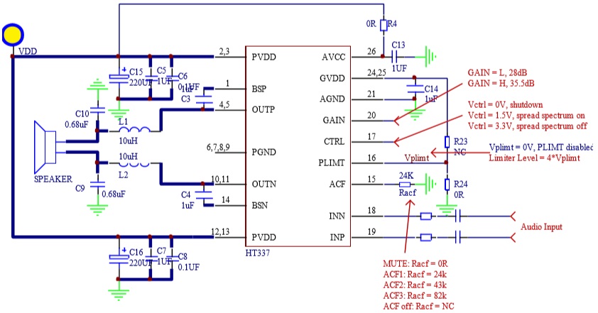 HT337具有防削頂失真(ACF)輸出控制功能,可檢測并抑制由于輸入音樂、語音信號幅度過大所引起的輸出信號削頂失真(破音), 也能自適應地防止在電源電壓下降所造成的輸 出削頂,顯著提高音質,創造非常舒適的聽音享受,并保護揚聲器免受過載損壞。