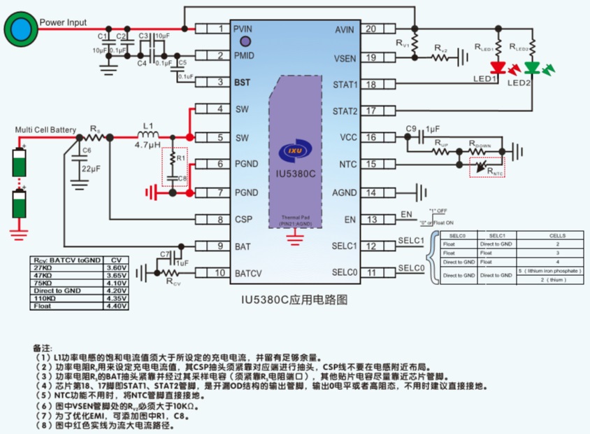 IU5380C具有完善的保護功能,包括輸入欠壓/過壓保護、電池過壓和短路保護,電池溫度保護NTC功能、芯片過溫保護。此外芯片通過外接2路LED指示燈對充電過程實現(xiàn)全程監(jiān)控。