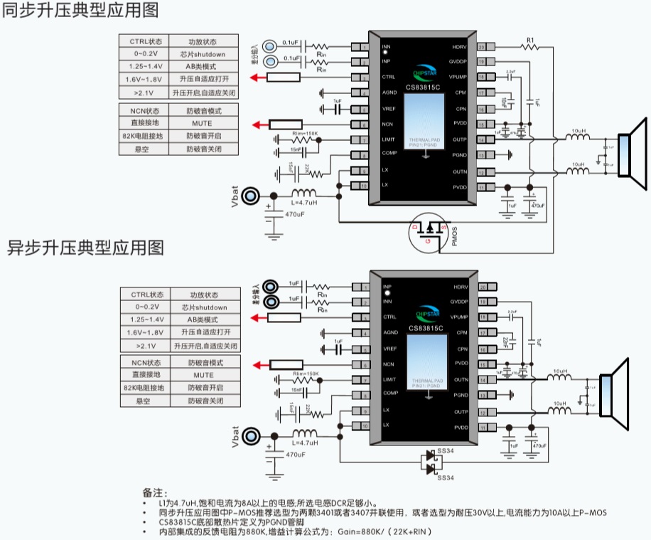 CS83815C是一款適用于2-3節鋰電池應用,帶防破音,AB/D切換,升壓模塊同步異步可選,并且升壓模塊具備自適應升壓功能的R類單聲道音頻功率放大器。