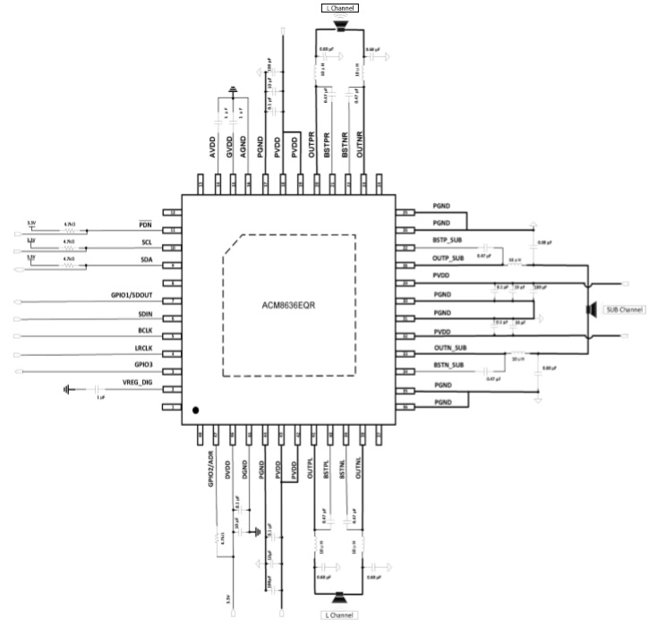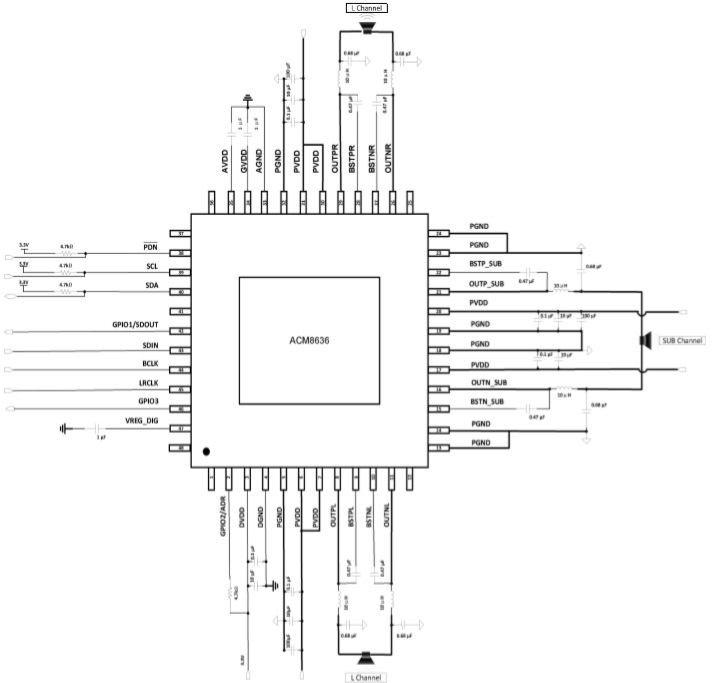 ACM8636一款2.1通道數字輸入音頻功率放大器。供電電壓范圍在 4.5V-26.4V。在2.1通道工作模式, 2 x 8 歐+4 歐負載下,輸出功率可以達到2×30W+60W ; THD+N不超過1%。